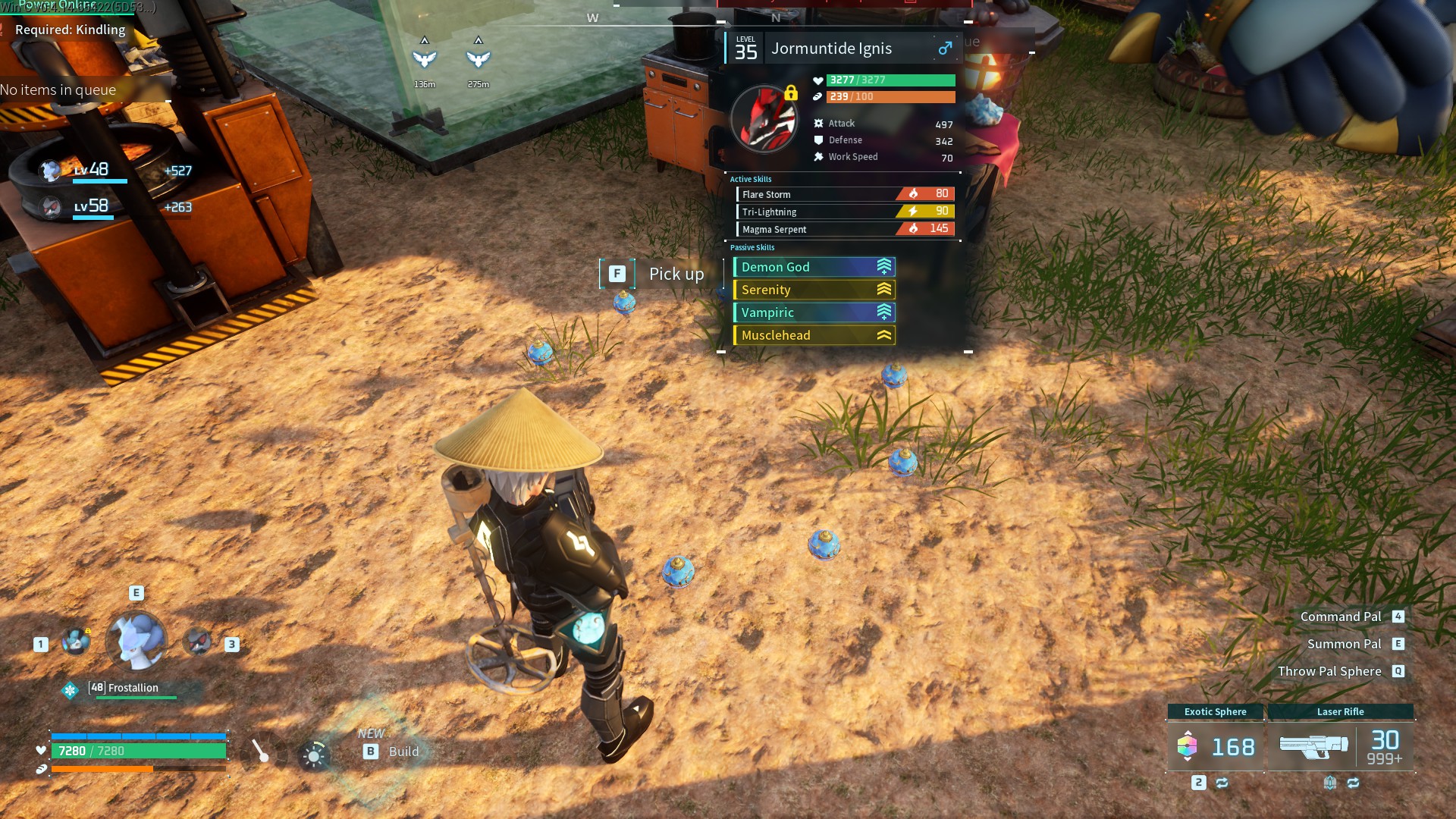 - Killing stuff in general, of course. The oil rings are good for that, but this patch added randomly spawning faction bases full of humans that each spawn a Pal, so clearing them out is good.
