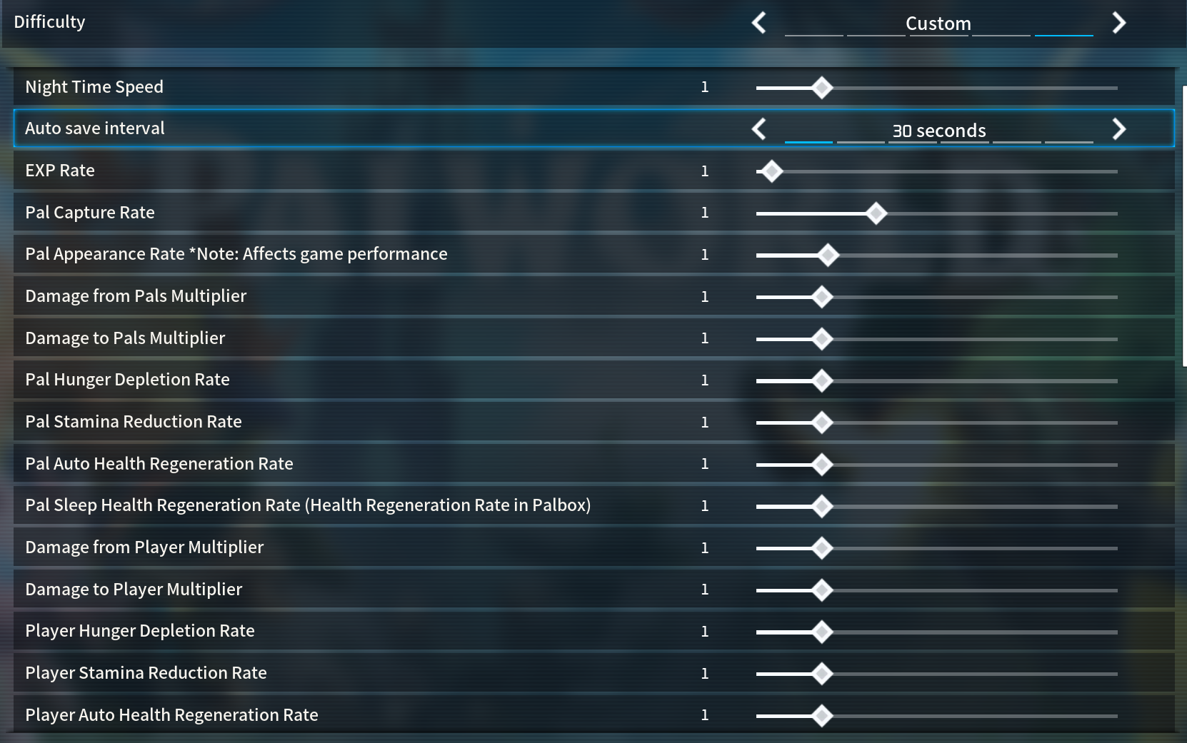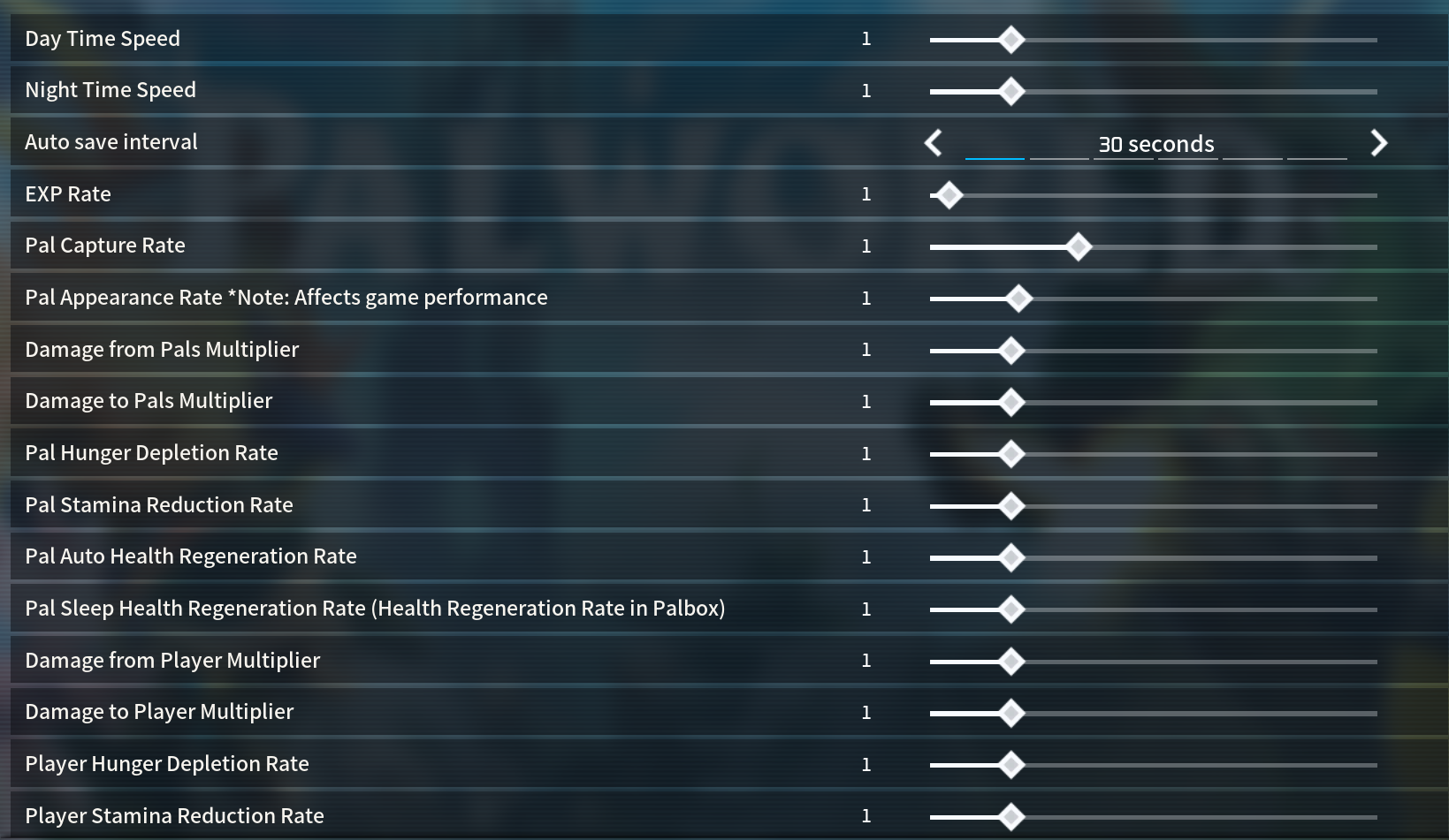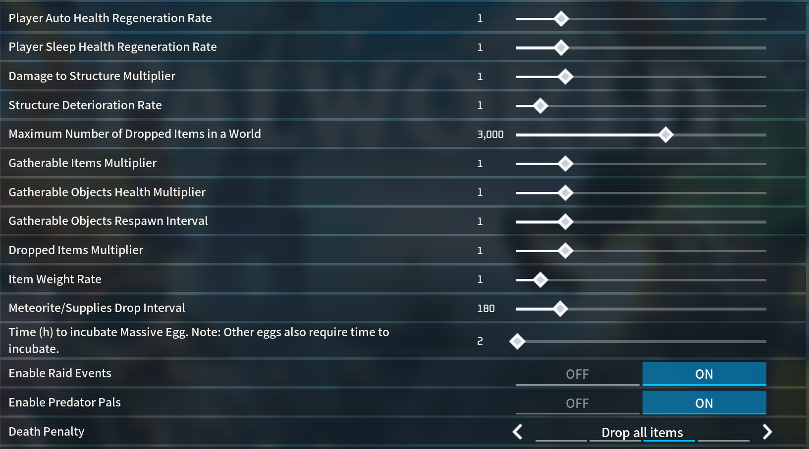 I would just leave everything at normal settings but maybe make XP go very slightly faster if anything since I remember it being slow as molasses in the endgame and increase the material gathering rate since multiplayer causes shortages for mining locations. I don't really see the need to make more pals spawn especially if it is going to cause duplicate bosses, but if it's possible to reduce their respawn timers that would be helpful