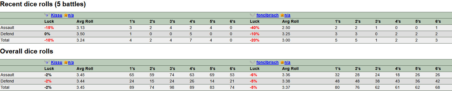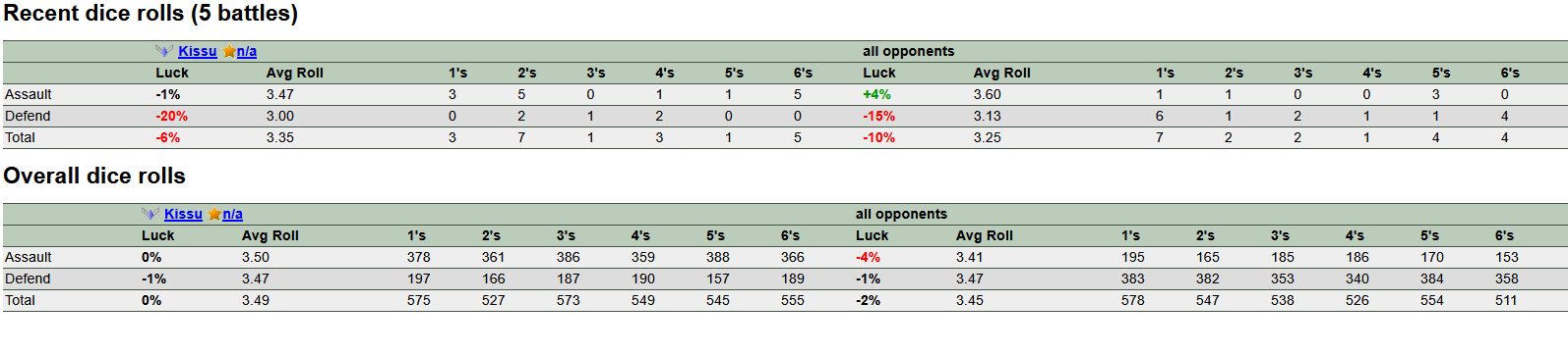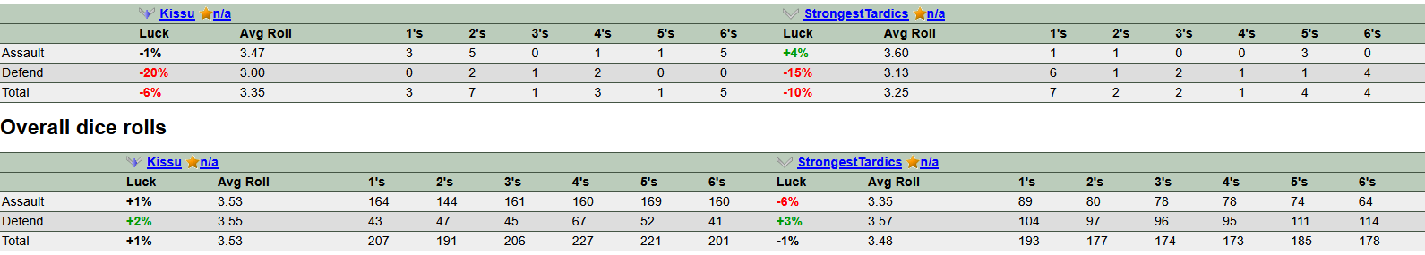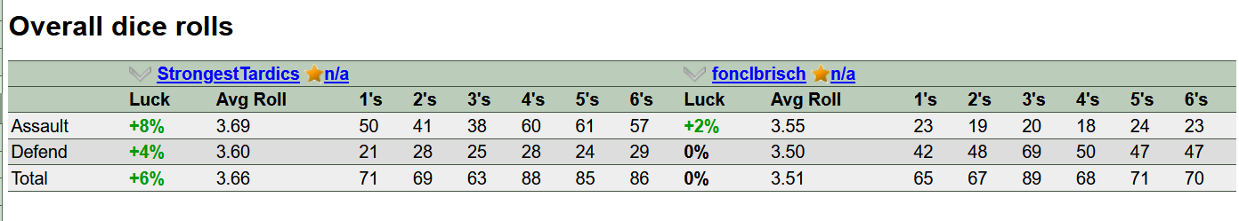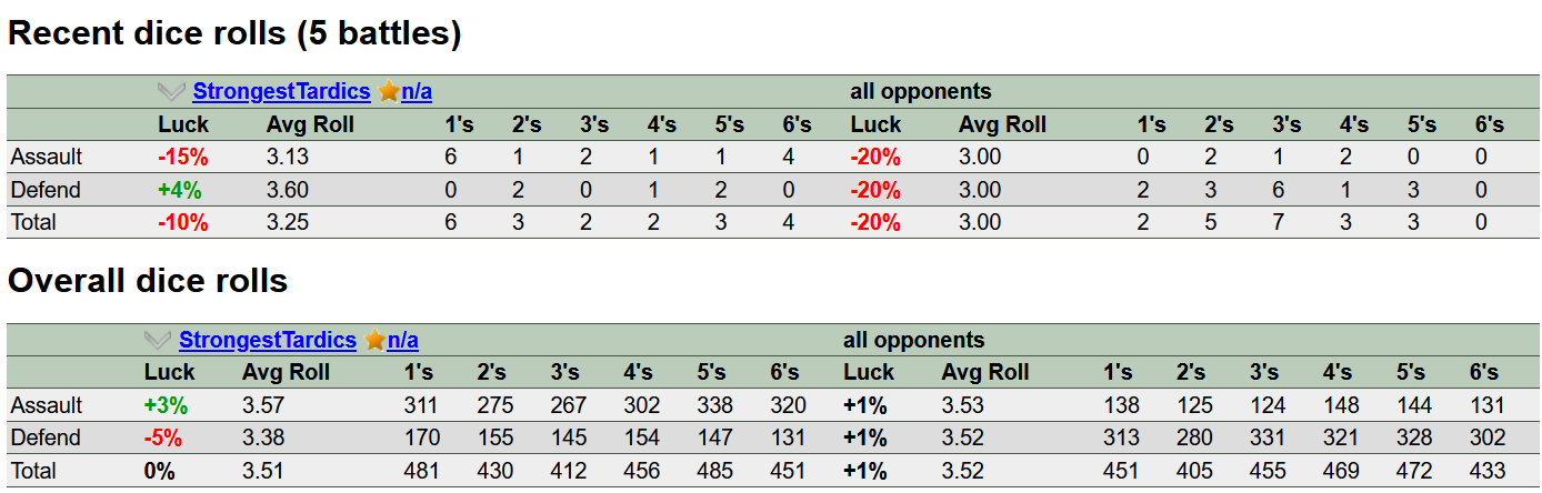 >>10879>>10878Most of the time when I roll 6s the other person does too. I always get them attacking and the other person always gets them when I do roll them. Since the defender's 6 beats the attackers it's rage inducing.