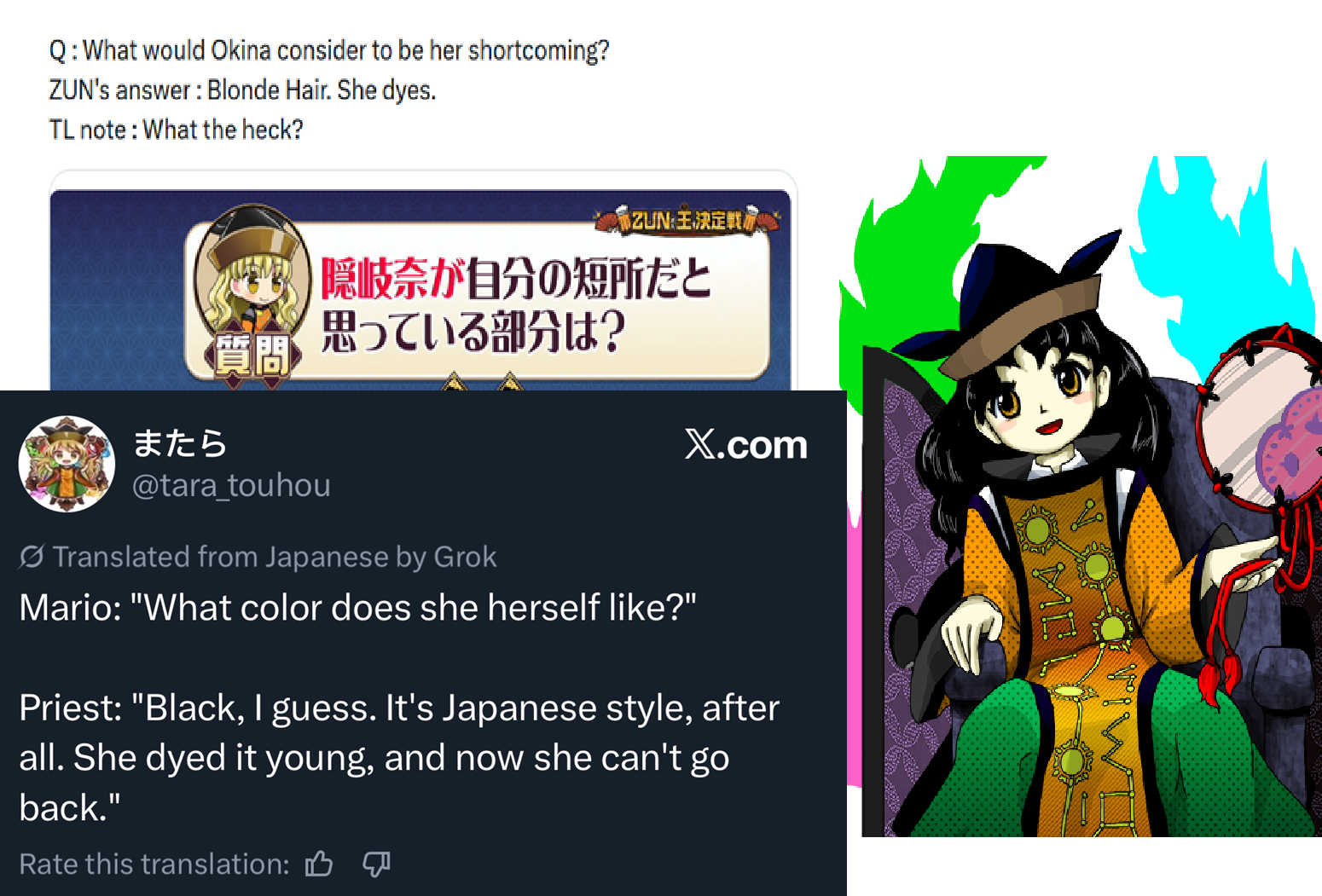 Okina, Mamizou and Sumireko are the holy trinity of forced hate targets by people that just want a scapegoat for whatever abstract thing is upsetting them about the modern games.