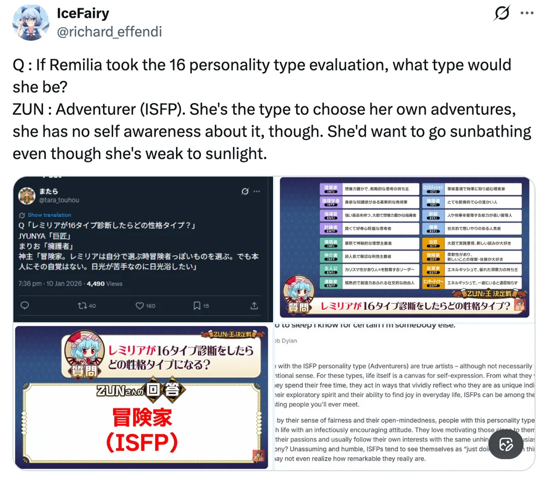 >I never understood how that's supposed to make a character interesting. Often serves to add to a character's origins and helps with headcanoning, so-on. The things that make Touhou fun. It's also much more interesting to adapt something into existence than just making a character up on the spot, I don't think Touhou would go far without folklore-based characters.