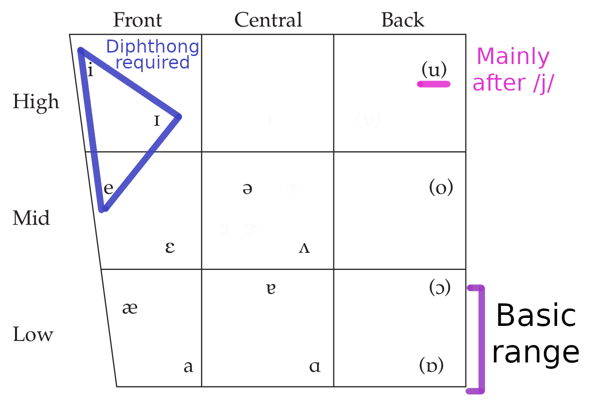 There's another one that stands out, which is ⟨/qa/mono⟩ (33). Again, Jap is very straightforward: /kemono/ [ke̞mo̞no̞]. However, this is a mid front vowel, which so far we haven't seen anywhere else. We haven't even seen /ɛ/, the DRESS vowel, which is below it and right above /æ/. From a preeliminary look at some