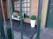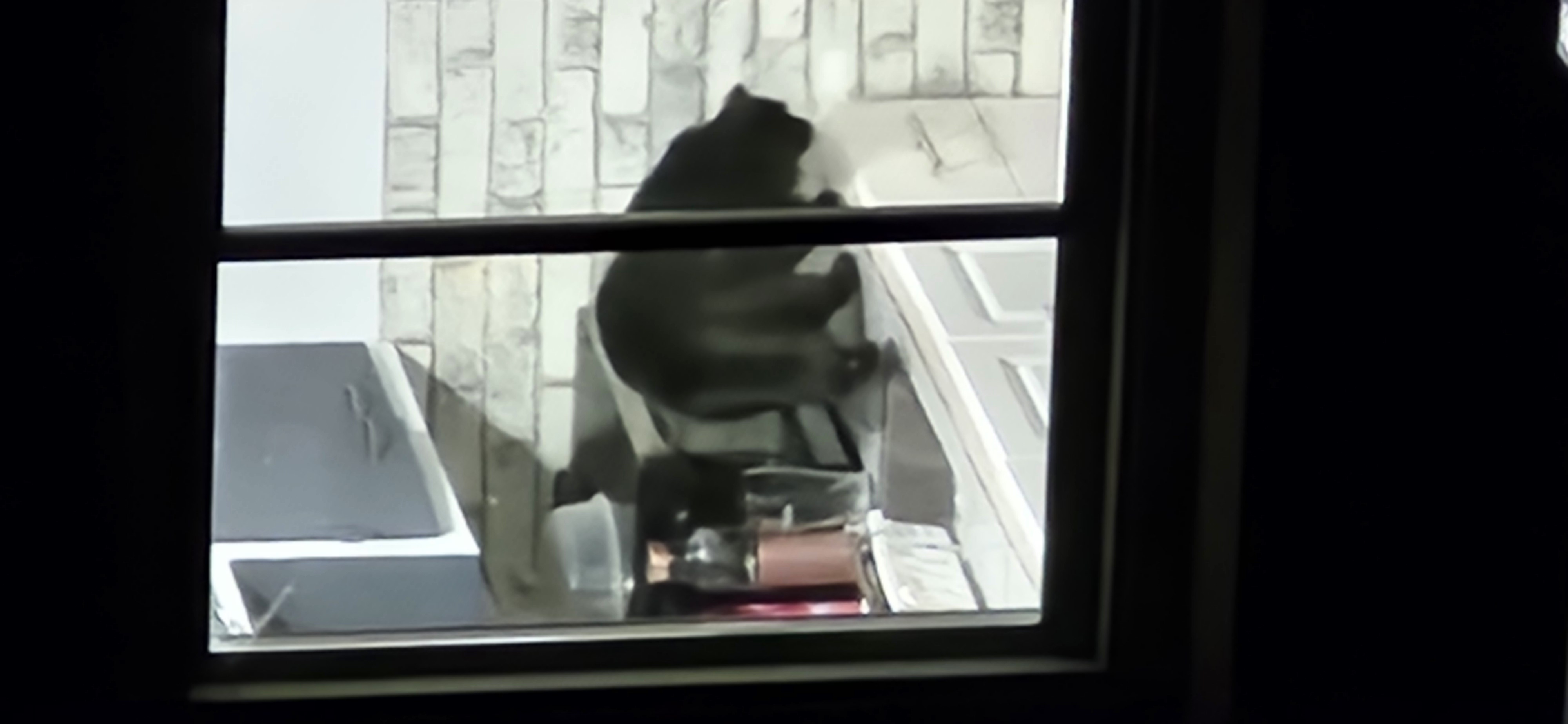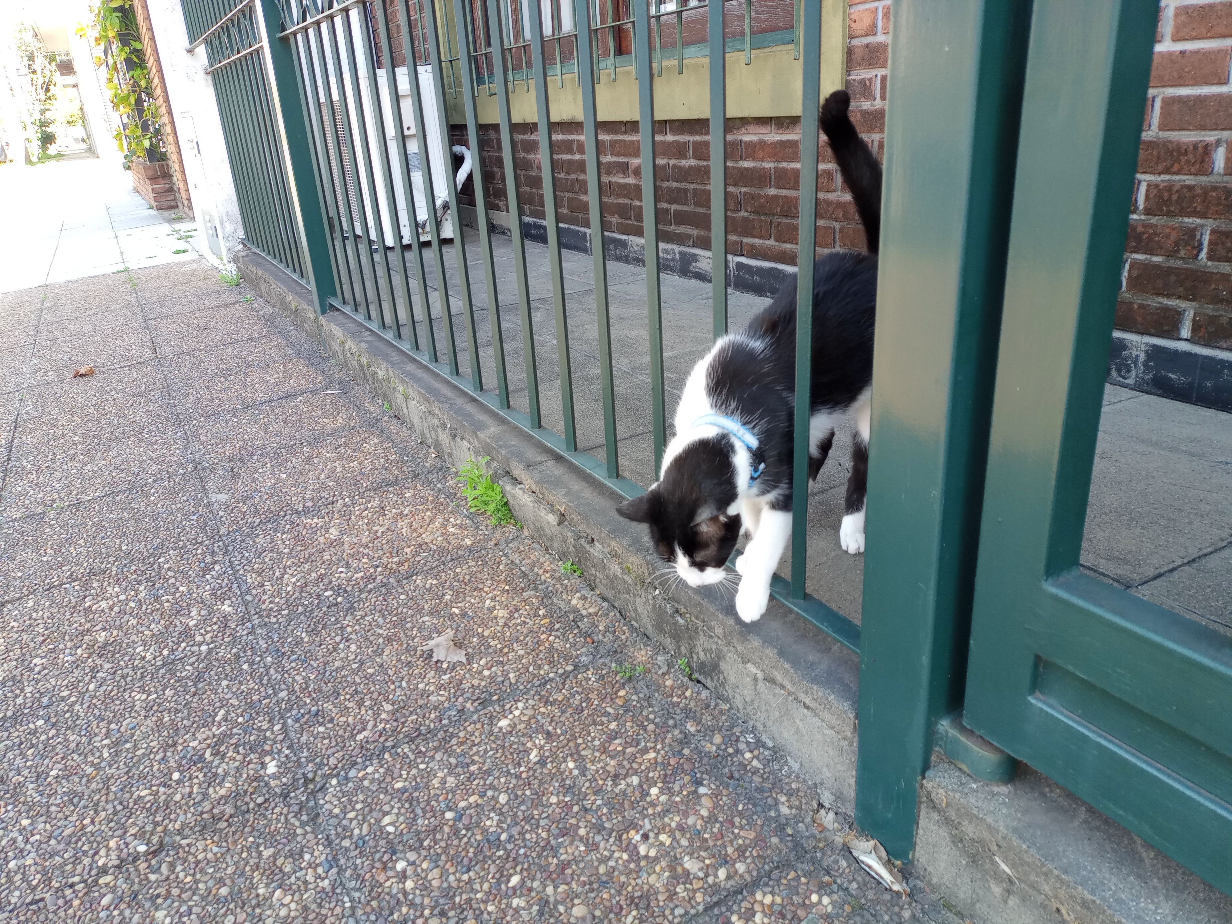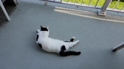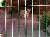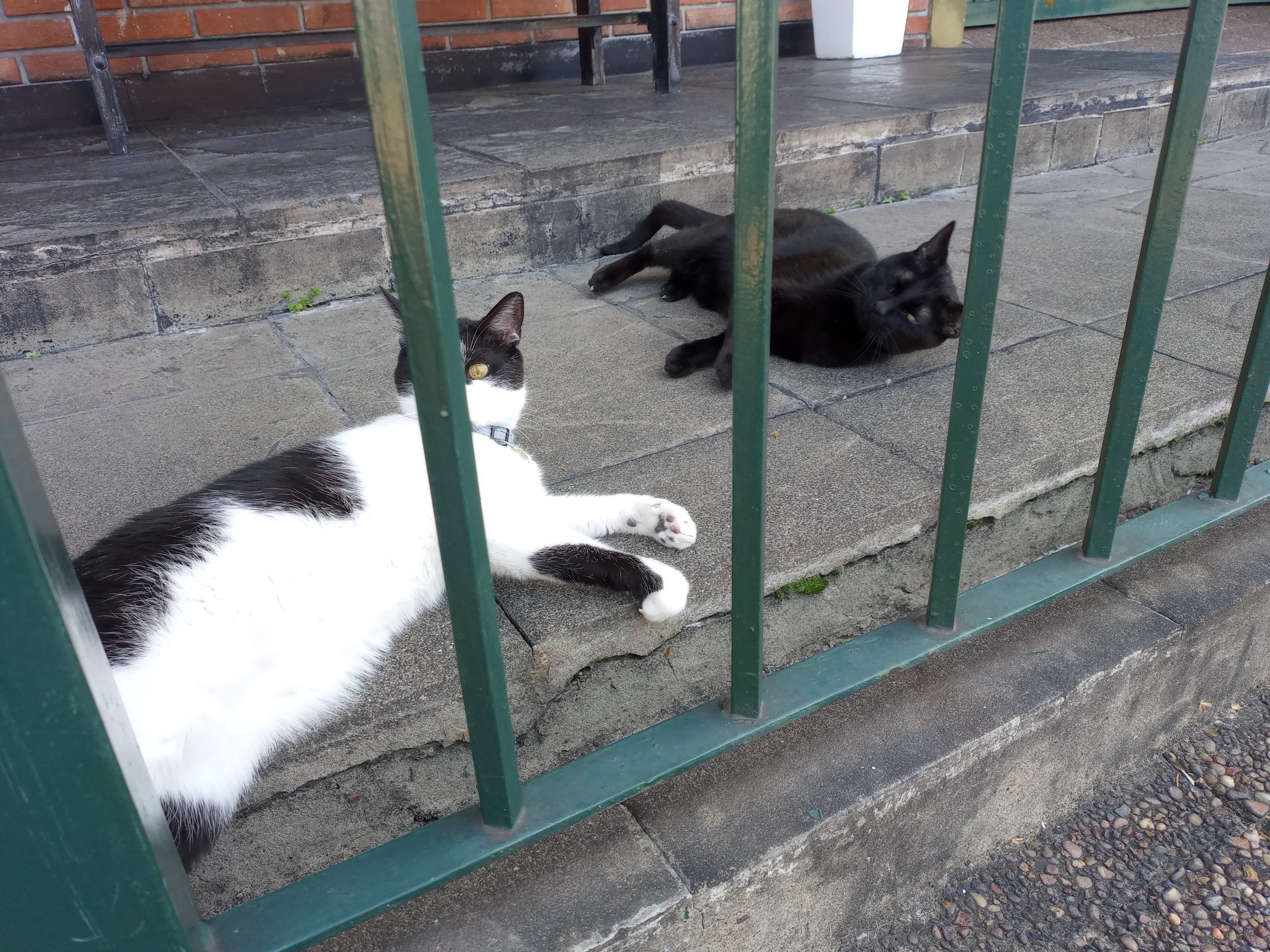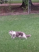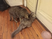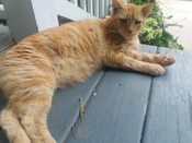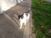 Thumb cat has found old cat's new hiding place. Old cat bullied her off the porch when I opened the door. Thumb cat tried to follow him inside but he wouldn't allow it.