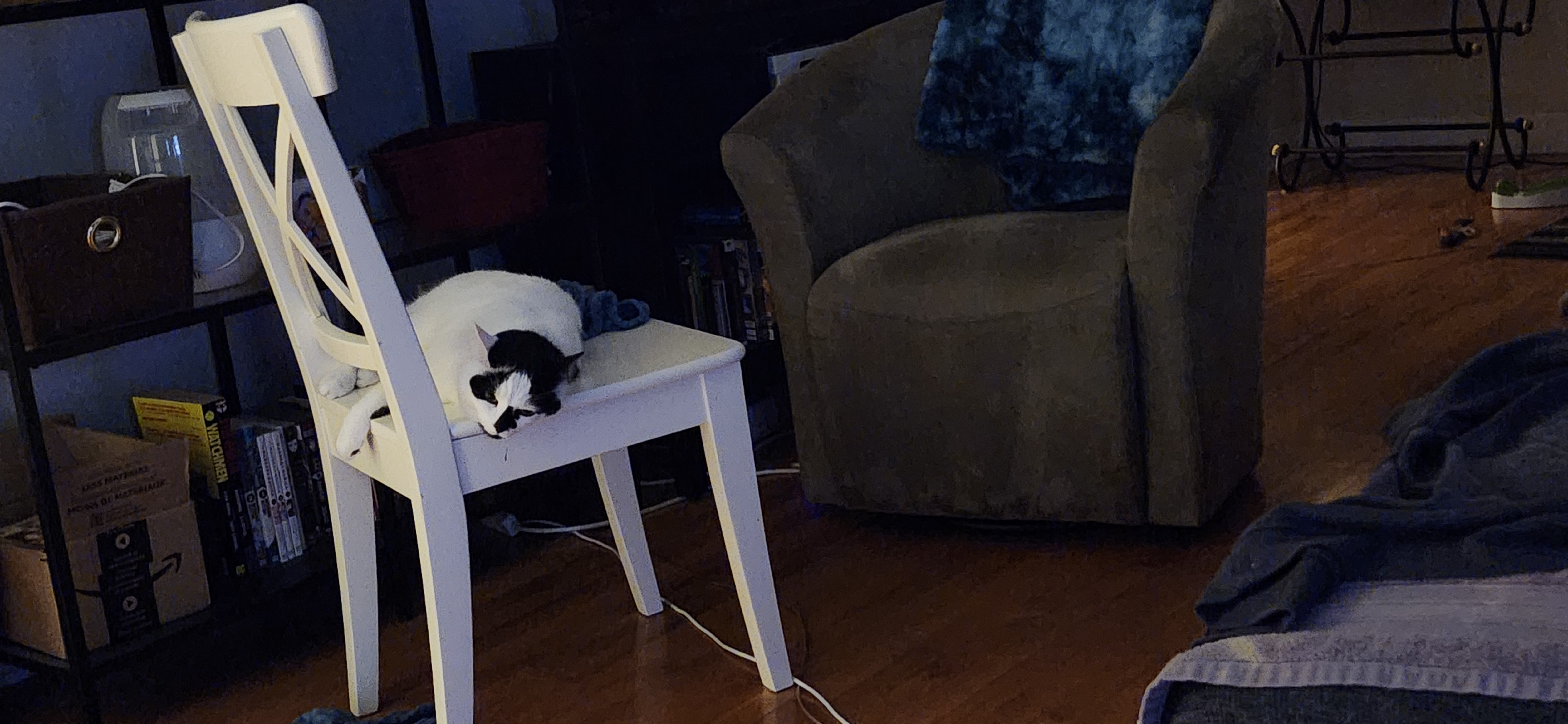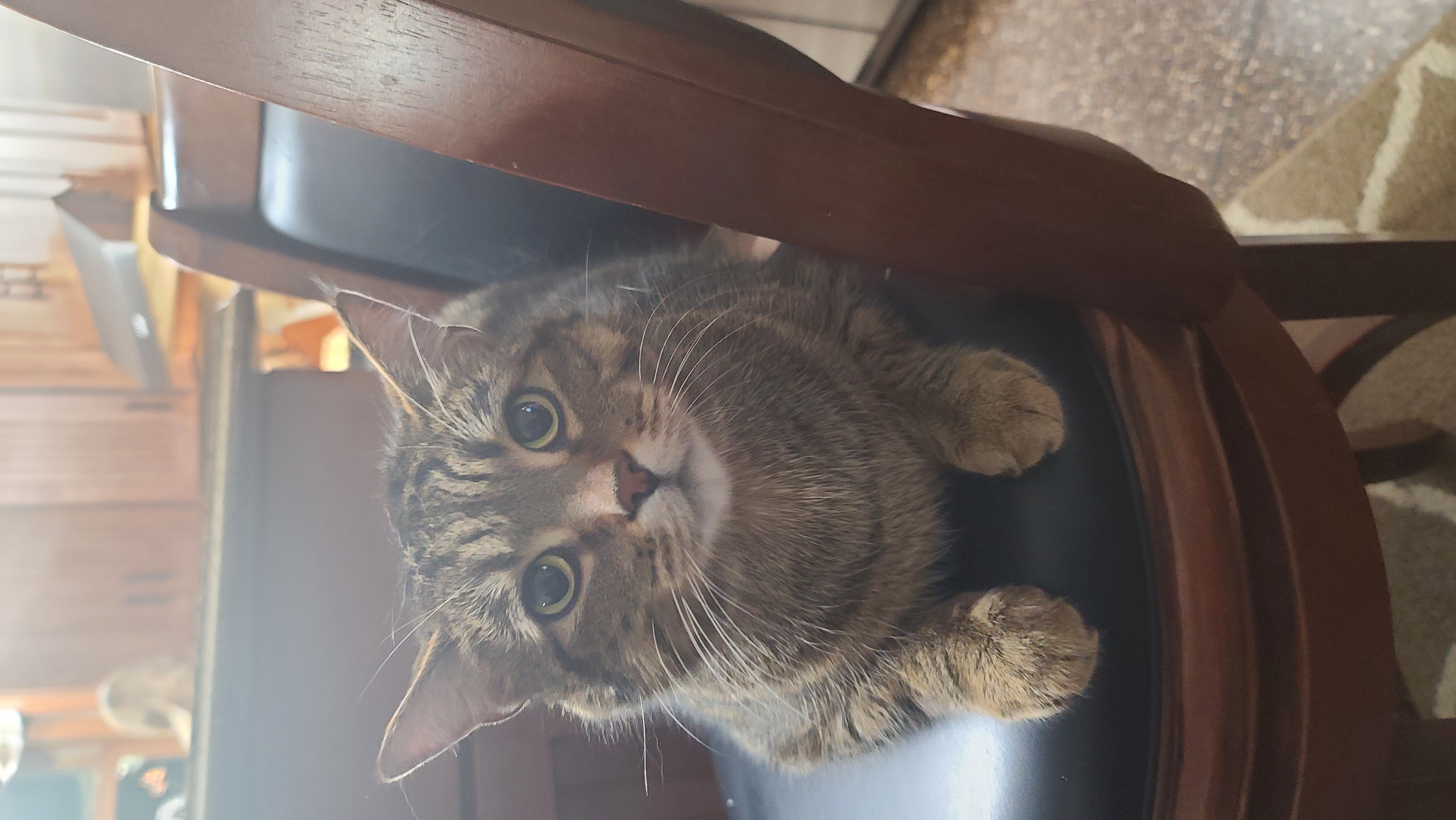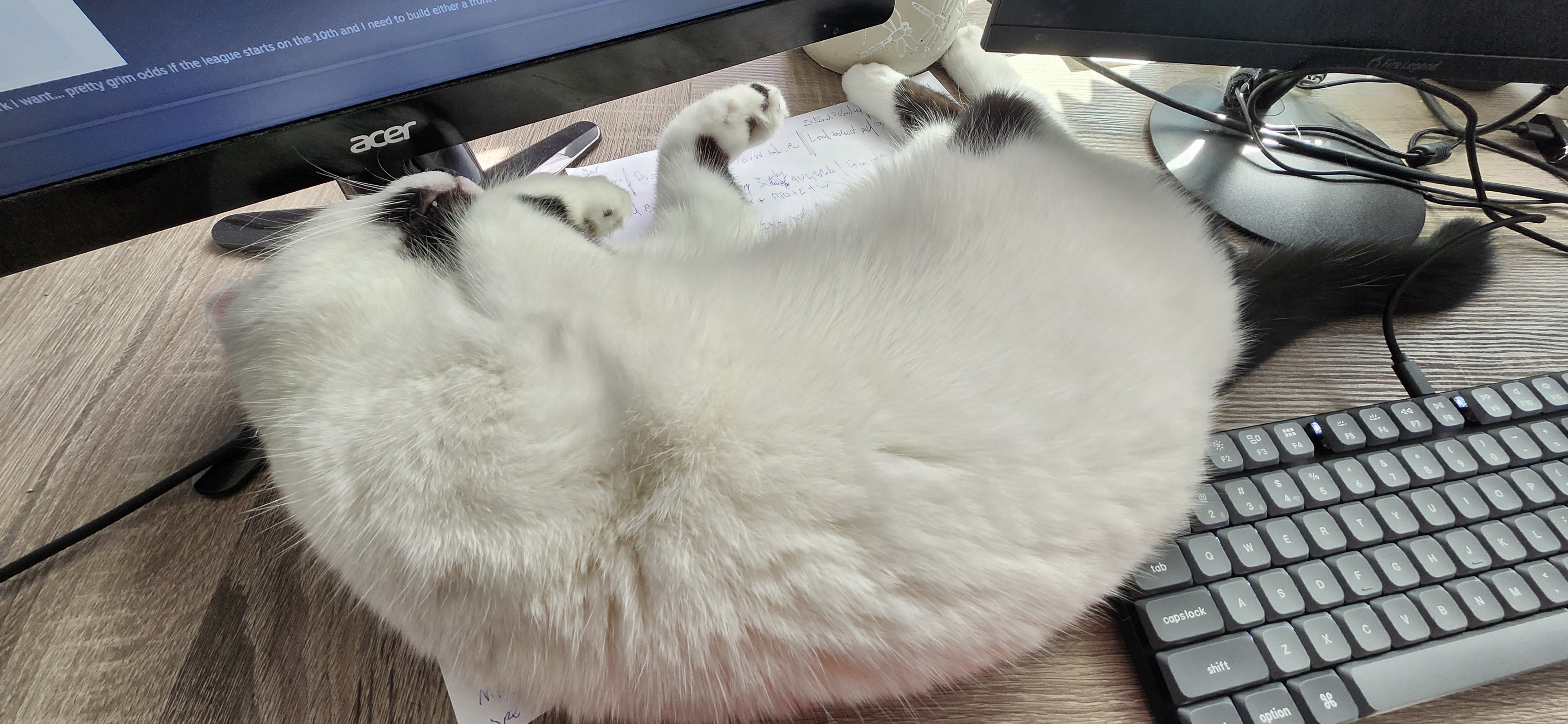 Decided to start rolling around in chair to refill glass with drinks and throw trash away, microwave food and everything else I do. Did this because cat refuses to leave lap and gets angry when I move him.