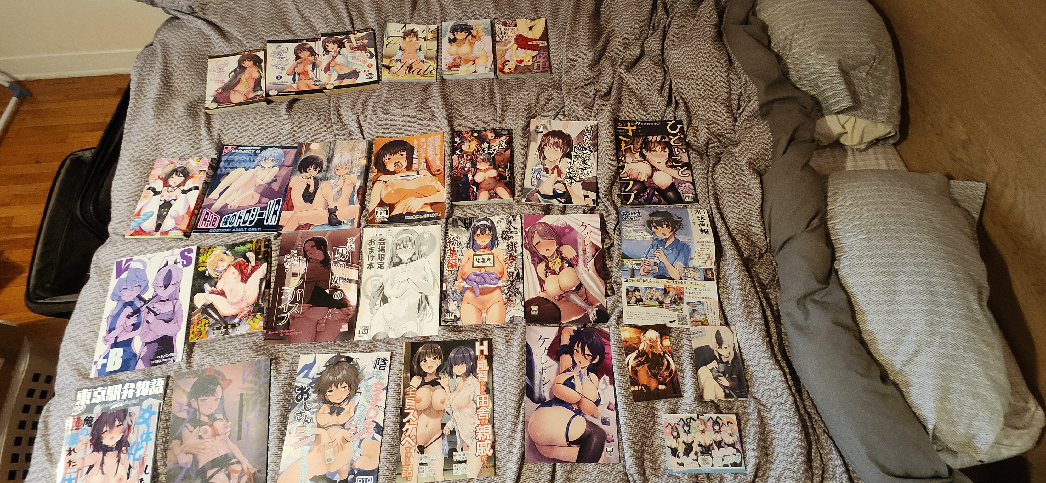 I have a sizable amount of manga and other books, but other than that rather little - I've picked up a few things, like a keychain, a t-shirt (for an anime I haven't even watched), and a handful of gacha machine items, when I've been to Japan, and I have also bought a couple of second-hand figurines for cheap locally, but that's about it.