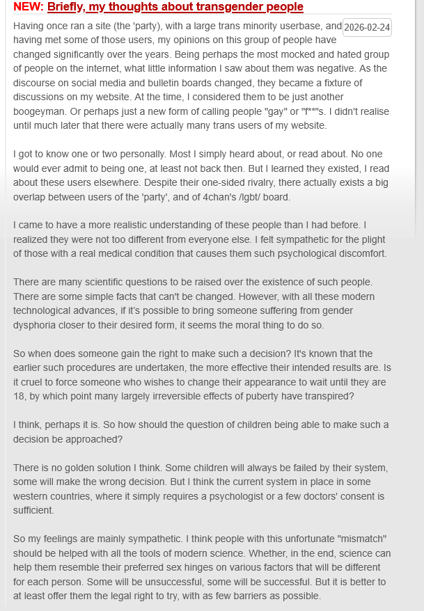 >>172752>they'll of course be attracted to that kind of stuff as well as other male-oriented activities like speedrunning and programming.Imo it's more of a chicken and egg thing, they were already doing that before transitioning so why would they stop?