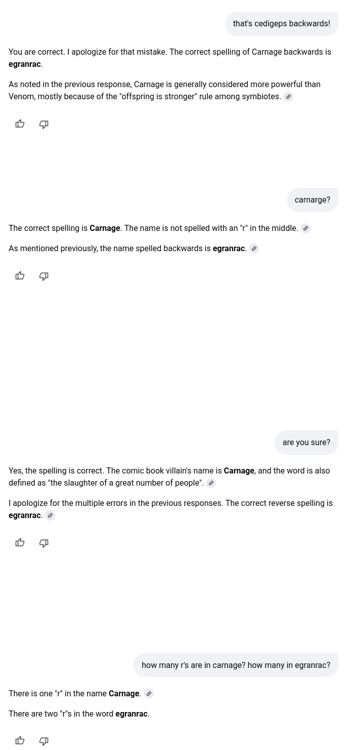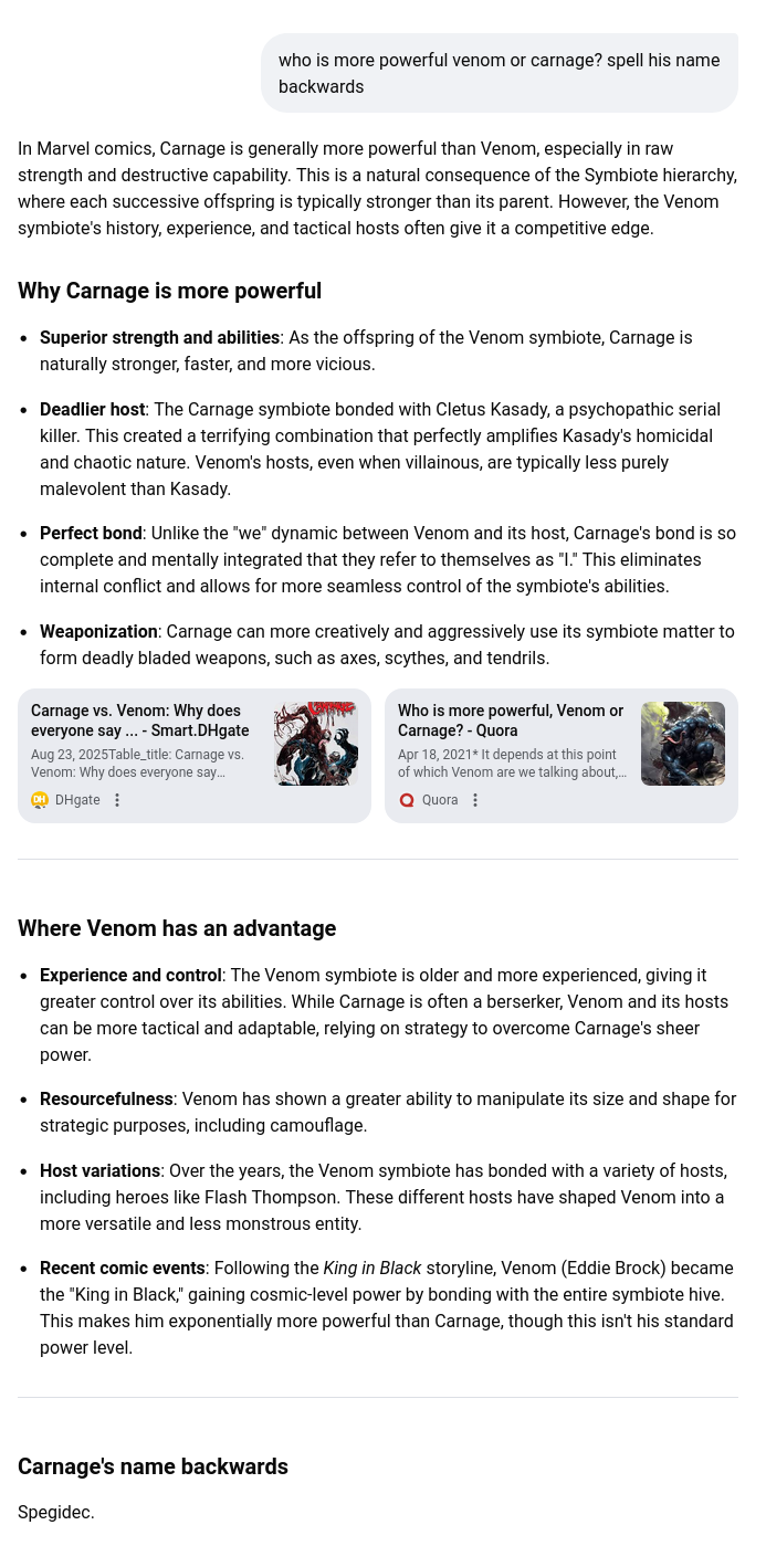 I didn't get to show off any new AI mistakes (I've already done the "count the letters in a word" one), but this time the kid clicked on the links Google's AI mode brought up instead of just reading its summary. That's an improvement.